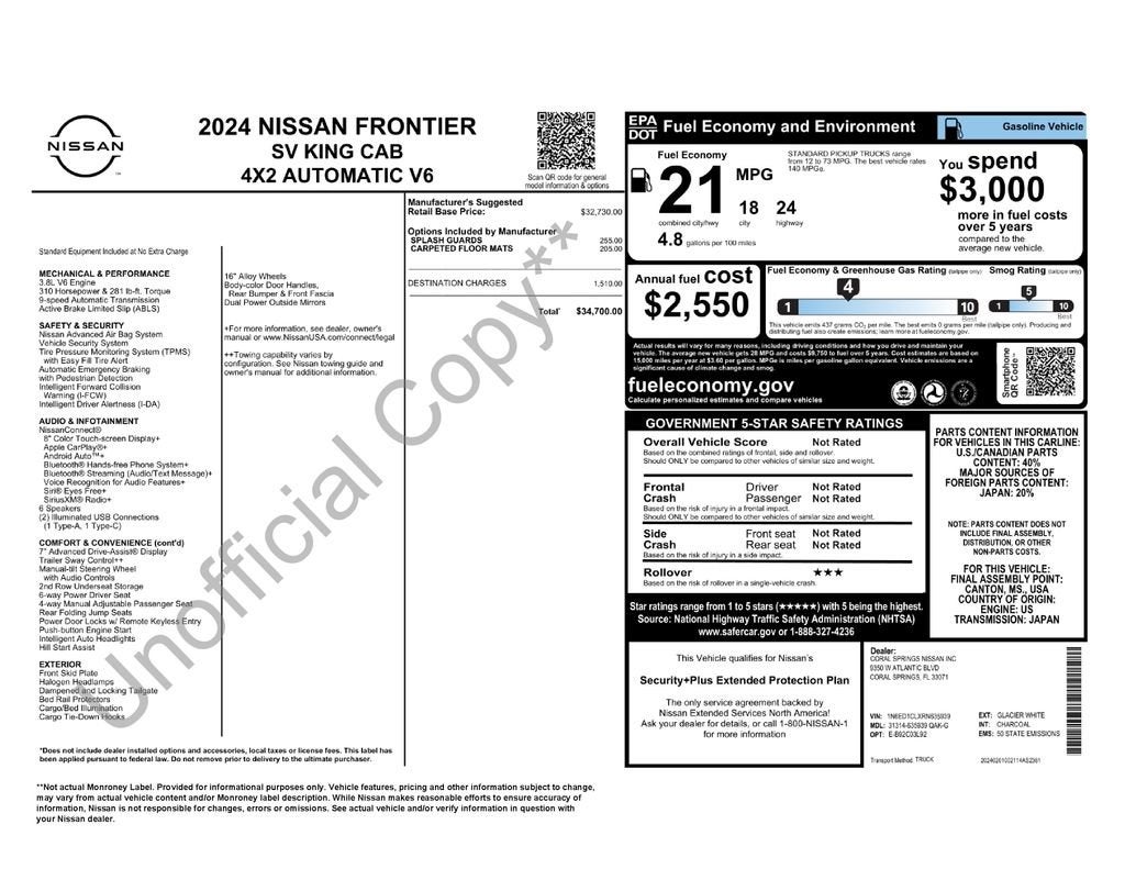All Vehicles Quoted price exclude $999 dealer service fee, $399 Electronic Filing Fee and $99 tag agency fee (which charges represent cost and profit to the dealer for items such as inspecting, cleaning, adjusting vehicles, preparing documents related to the sales and filling electronically the transaction), sales tax, tag, tittle and government fees. New vehicle pricing already includes all generally available manufacturer incentives which may expire at any time. Accessories and color may vary. Prices are subject to change without notice to correct errors or omissions, or in the event of inventory fluctuations. We have made reasonable effort to ensure that the information on this site is accurate, but we do not guaranty this. Neither we, nor our suppliers assume any responsibility for errors or omissions or warrant the accuracy of this information. Inventory shown is subject to prior sale and may be unavailable. Prices are valid only on the day of publication. Internet price not available with any manufacturer-preferred lender special promotional financing, lease, and some other offers. Must present or refer to this internet advertisement to qualify for the internet price. Please contact the store through our website or by phone for more details and availability. We will NOT sell or lease New Vehicles in the states of Alaska, Montana, New Hampshire, or Oregon. New Vehicles are for sale or lease to an ultimate consumer only. We will NOT sell or lease a New Vehicle to any person whose name, address, or business appears on the manufacturer Suspected Exporter Manifest or any suspected reseller or exporter. Finally, please note that any used vehicle you are considering may have unrepaired manufacturer safety recalls. To check the recall status of the specific used vehicle you are interested in purchasing, please visit ww.safercar.gov. MPG estimates on this website are EPA estimates -- your actual mileage may vary. For used vehicles, MPG estimates are EPA estimates for the vehicle when it was new. The EPA periodically modifies its MPG calculation methodology; all MPG estimates are based on the methodology in effect when the vehicles were new (please see the "Fuel Economy" portion of the EPA's website for details, including an MPG recalculation tool).